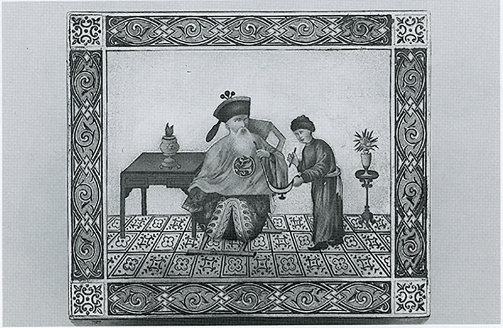 The silversmith who created the tea caddy, Alexander Benediktovich Lyubavin, was one of those who adopted these ancient techniques. You can see beautiful, multicoloured champlevé enamel on the tea caddy’s sides and top. Some of the colours – the orange on the curtain, for example – are vivid, in line with the palette commonly used in Russian enamelling, but others are more subtle. It displays scenes from Chinese courtly life. According to Richard Hare, who featured it in his book, The Art and Artists of Russia (1965), it is a rare example of Russian chinoiserie; a Lyubavin tea caddy with similar scenes was recently sold at auction.[2] Lyubavin’s firm was awarded an Imperial warrant.
