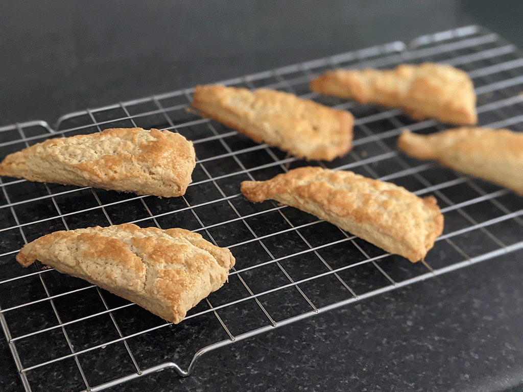 Mix the 75 g of softened butter and 25 g of sugar together. Spread this mixture over the top of your dough. Dora’s instructions called for rolling the dough out like this, but in our experience, this creates a buttery mess, so we would recommend pulling up the edges of the dough and tucking them over the butter/sugar mix so the butter is encased in dough. Roll out the dough into a circle 1 cm thick. Cut the circle into twelve wedges. Place wedges a few cm apart on a baking tray lined with greaseproof paper. Beat the egg together with a splash of water and lightly brush on top of each wedge before baking. Dora’s recipe advised baking them for 20 minutes, but they only took 16-18 min in our oven, so check them around the 15 minute mark. They are done when they are lightly browned on the top and bottom. Enjoy warm with jam and a cup of Dora’s famous cardamom-infused coffee or your choice of tea (Dora was partial to lotus tea).